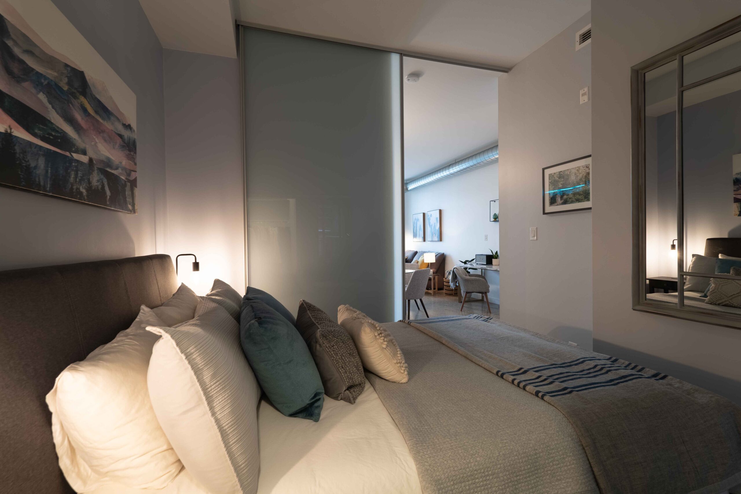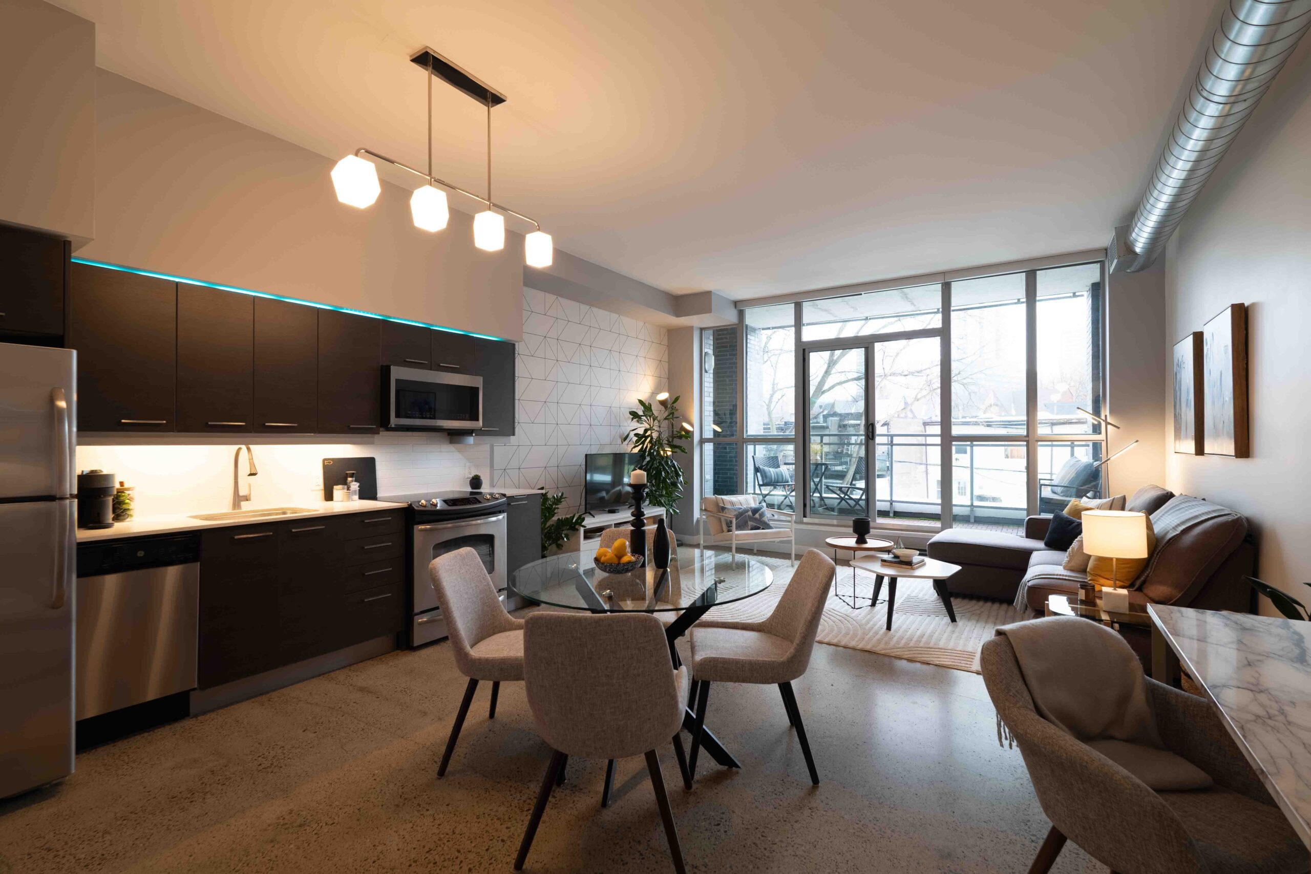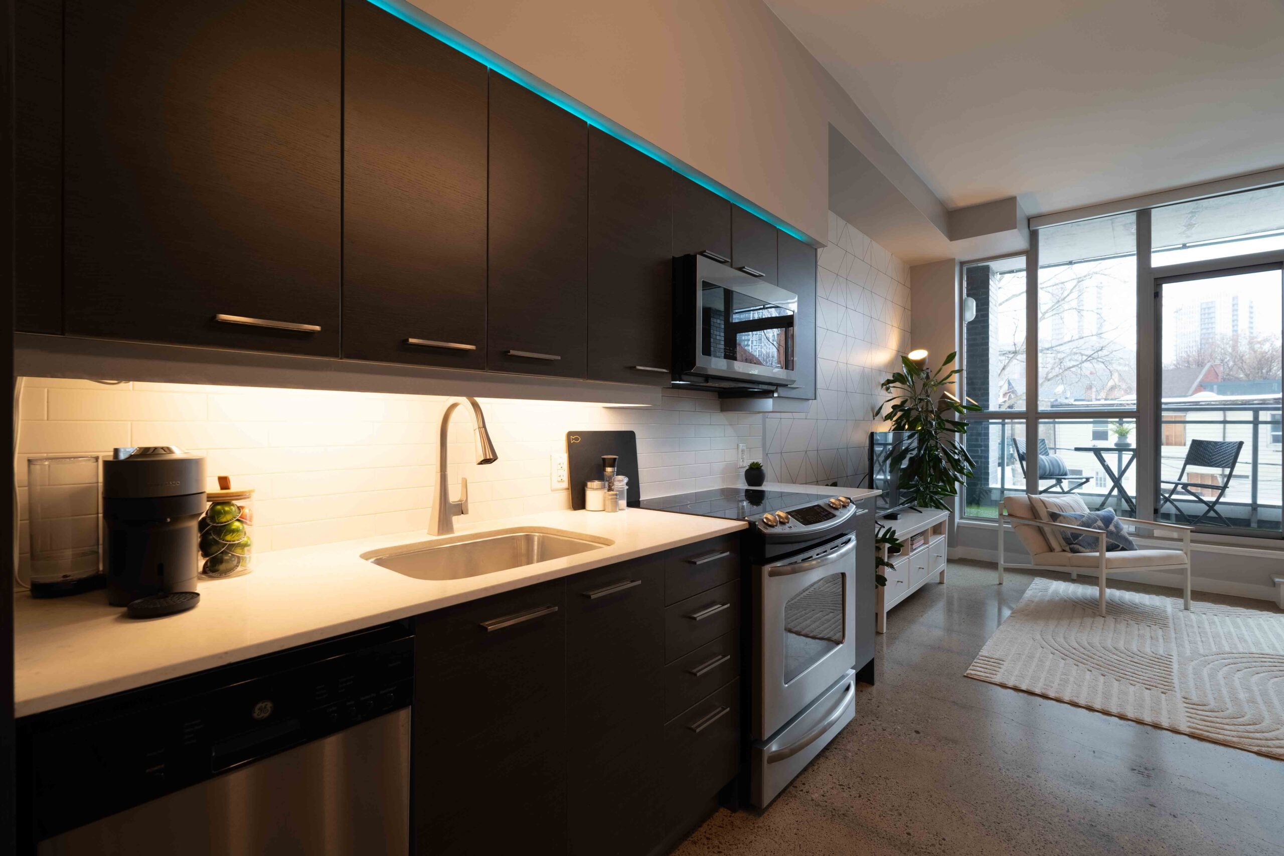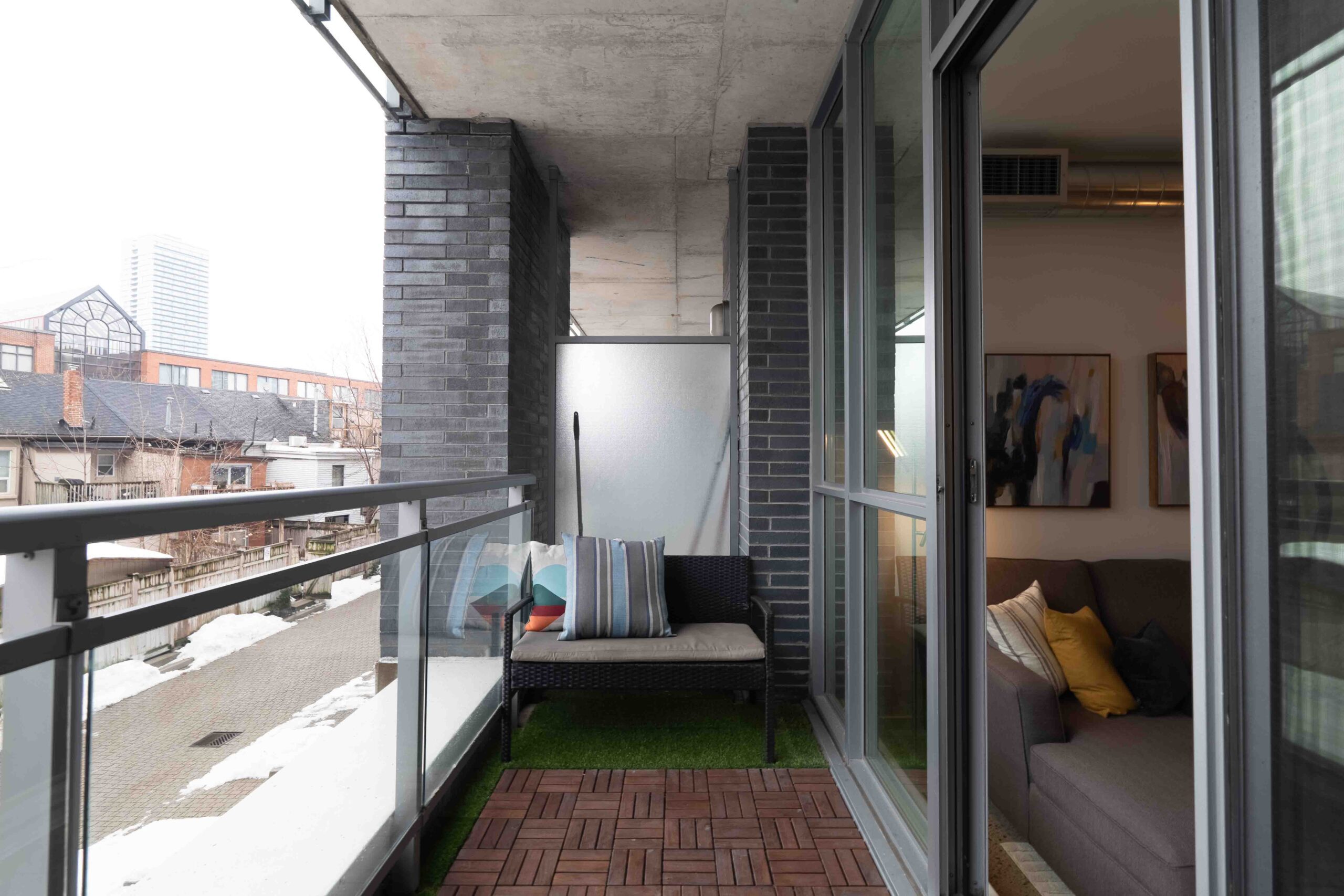 Welcome to stylish loft living at 510 King Street East #215, a bright and spacious one bedroom suite in the heart of Toronto’s vibrant Corktown district. Offering approximately 650 sq. ft., this thoughtfully designed home features soaring 10-foot ceilings, cool modern concrete floors, and floor-to-ceiling windows that fill the space with natural light. Quietly positioned on the backside of the building, the suite enjoys a peaceful setting rarely found in the city. A walk-out from the living area extends your living space outdoors, perfect for morning coffee or evening unwinding. The favourable open-concept layout maximizes flow and functionality, creating an inviting space for both daily living and entertaining. The modern kitchen integrates seamlessly into the living and dining areas, while the well-proportioned bedroom offers comfort and privacy, complemented by a walk-in closet. A rare and valuable feature, this unit includes one of the larger parking spaces in a prime location, with EV chargers available in visitor parking, an exceptional convenience for city living. Residents of this boutique building enjoy premium amenities including a fully equipped fitness centre, stylish party and lounge spaces, rooftop terrace with city views, and concierge service making it one of Corktown’s most desirable addresses. Located in the sought-after Corktown neighbourhood, you are surrounded by beloved cafes, restaurants, and local shops, with the Distillery Historic District, Corktown Common, and St. Lawrence Market just minutes away. Easy access to trails, transit, and the downtown core offers the perfect balance of green space, historic charm, and urban convenience. Experience the character, connectivity, and lifestyle that make Corktown one of Toronto’s most exciting places to call home.